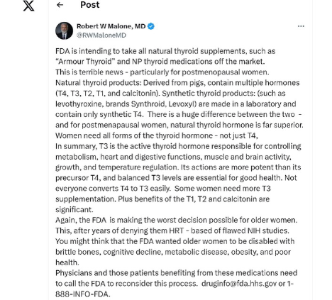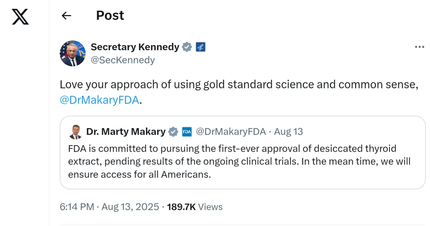 In case you're wondering, desiccated thyroid has been promoted by a lot of the common pseudoscience peddlers and culprits within the MAHA movement. For example, Will Cole, Josh Axe, Courtney Swan, and others collaborated on a joint post about the FDA letter.