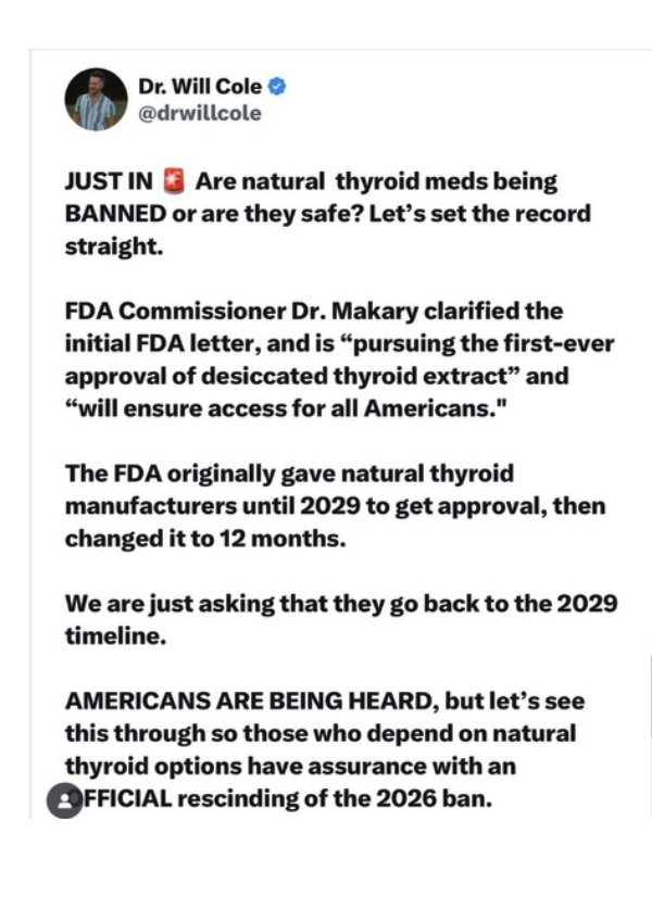 We are dedicated to gold-standard science through clinical trials of desiccated thyroid extract; however, we must continue to ensure access for all Americans to products that the FDA has expressed concern over, largely due to a lack of gold-standard science. This exchange is more akin to pressure from the industry and key individuals, some of whom may benefit financially from desiccated thyroid extracts. Will Cole stated in his post that he utilizes it daily for telehealth visits and similar products.