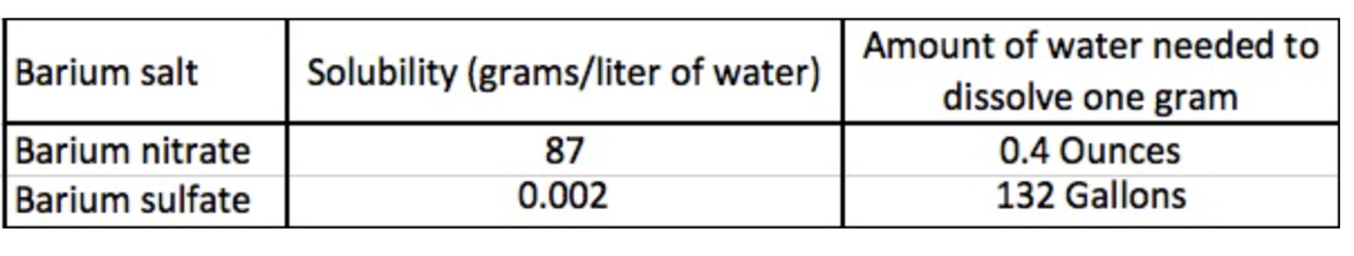 The girl who swallowed the 20 grams of barium nitrate survived, but barely. And she was very lucky. A dose as little as one gram can be lethal. So, how can one gram of barium nitrate be lethal while barium sulfate is so harmless that it is impossible to give someone a lethal dose [2]? Hint: it has something to do with the nitrate, but it is not caused by it. Here's the answer—solubility.