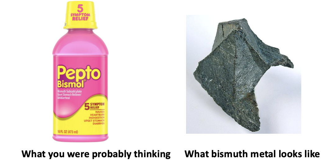 If you've ever uttered the word "bismuth" once in your life, 99.99% of the rest of the world will automatically think of the stuff on the left. However, bismuth metal actually looks like that boring thing on the right.