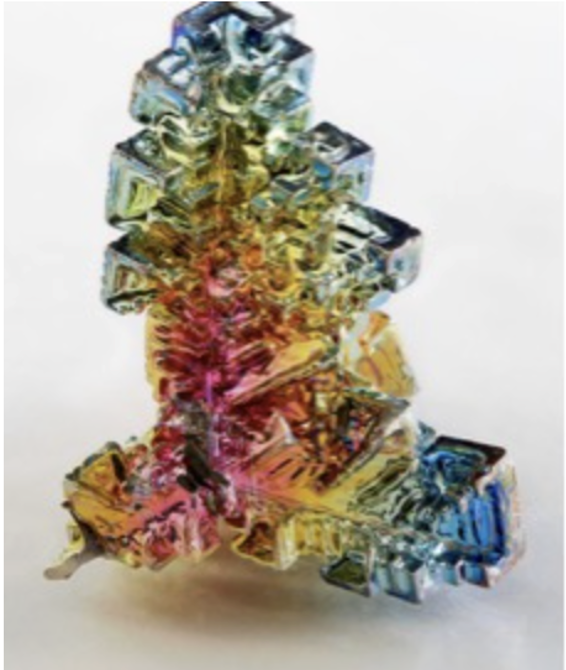 When bismuth is left in the air, it quickly reacts with oxygen to give a thin film of bismuth oxide. The oxide has light-scattering properties, which are responsible for the spectacular colors. The colors are dependent on the thickness of the film. Wow! (Photo: Wikipedia)