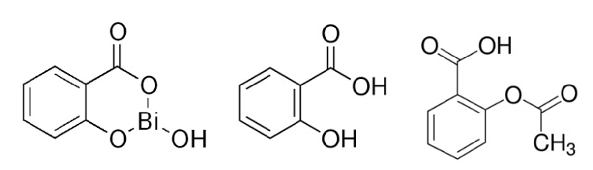 Bismuth subsalicylate (left) is a complex of salicylic acid (middle) and bismuth oxide. Note the structural similarity to aspirin (acetylsalicylic acid, right). This is the reason that people who are allergic to aspirin may have problems with Pepto Bismol.