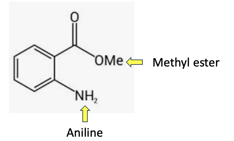 Methyl anthranilate is the methyl ester of anthranilic acid, aka 2-aminobenzoic acid – an aromatic amino acid. In nature, it is found in many fruits, such as grapes and oranges, as well as in a variety of flowers, including jasmine and gardenia. As is the case with many fragrance chemicals, it is part of the plant’s volatile "bouquet," helping to attract pollinators with its fruity and floral scent. In Concord grapes, methyl anthranilate reaches concentrations high enough to define the fruit’s characteristic musky aroma that many people associate with grape juice, jams, and candies. But if you're eating Thompson Seedless grapes, there won't be any.