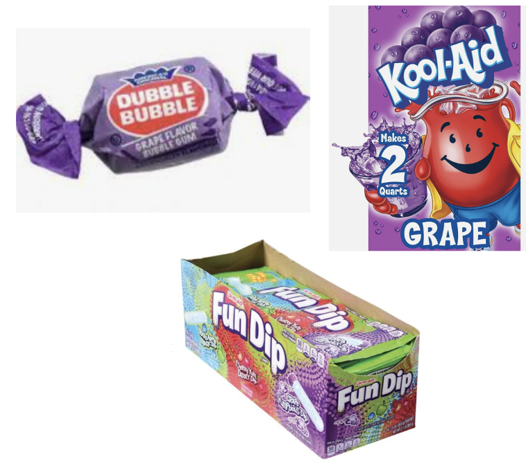 Naturally delicious Grape Dubble Bubble, LIK-M-AID, now called Fun Dip, and Kool-Aid