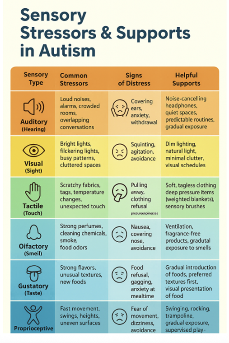These are not luxuries—they are evidence-based supports. Studies show that when sensory stress is decreased, autistic individuals often exhibit fewer “challenging behaviors,” better emotional regulation, and improved participation in school and work. However, what calms one person may overwhelm another.