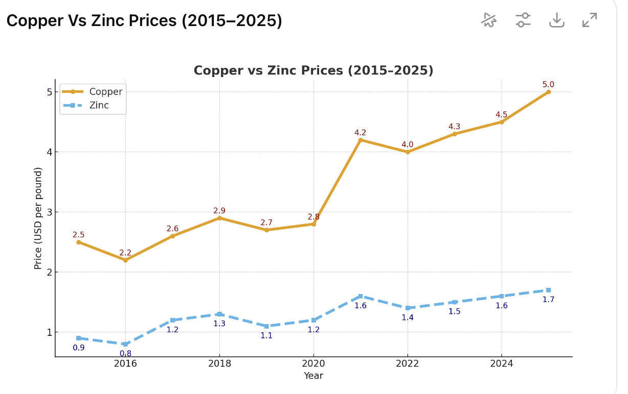 Figure 1. Copper and zinc prices (2015–2025). Calculated from publicly reported historical values using standard unit conversions, with reference data drawn from Trading Economics, the USGS, the World Bank Pink Sheet, and IMF commodity price databases, and all values and the graph were generated by ChatGPT.