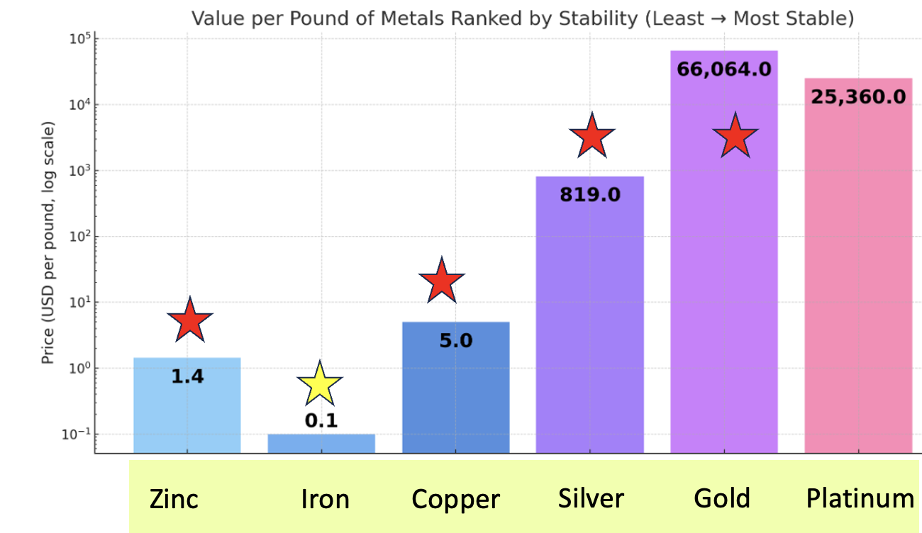 Figure 2. Prices per pound for selected metals arranged by chemical stability (least → most stable). Values (log scale) were calculated from publicly reported spot prices using standard unit conversions, with reference data drawn from Trading Economics, Kitco, USGS, and other commodity databases; ChatGPT generated all values and the graph. A logarithmic scale is used to show the wide range of metal values. All metals used in US coins have a star. The yellow star for iron indicates a one-time use.