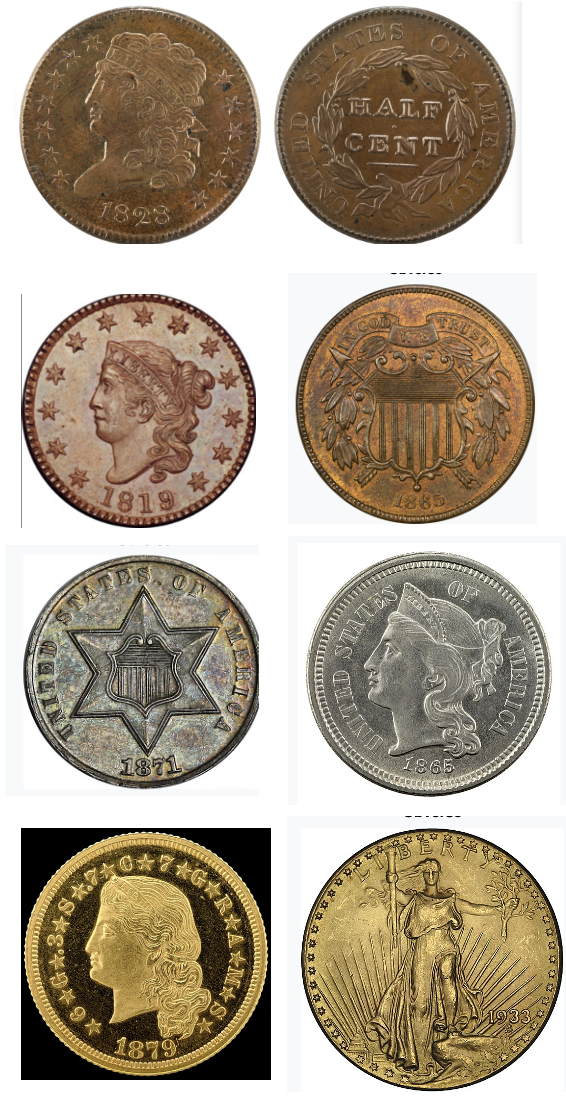 Bottom: (Left) $4 gold coin (very rare, can be worth $1+ million), $20 gold piece (often thought to be the most beautiful American coin ever made.