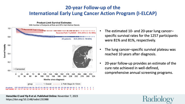 “The 84.5% 5-year lung cancer-specific survival rate among low-dose CT arm patients with screen-detected stage I lung cancer is higher than the 66.8% rate among those in the same arm with non-screen-detected stage I lung cancer.”