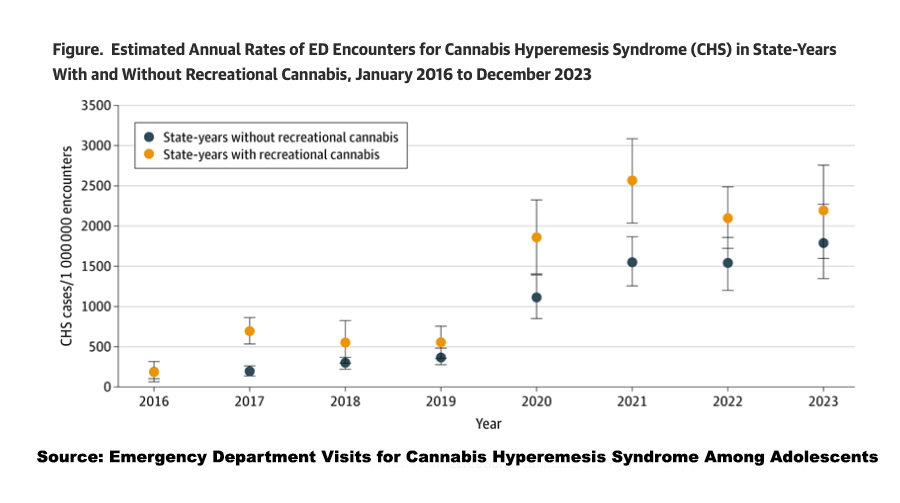 A paper in JAMA Network Open reports a sharp rise in CHS-related emergency-department encounters among adolescents and young adults over the past several years, and it breaks the pattern out by policy environment. In the figure below, the authors compare state-years where recreational (adult-use) cannabis was legal and dispensaries were open with state-years where recreational cannabis wasn’t legal. The “recreational-legal” line runs higher, and both groups climb steeply starting around 2020—suggesting this isn’t confined to one type of state.