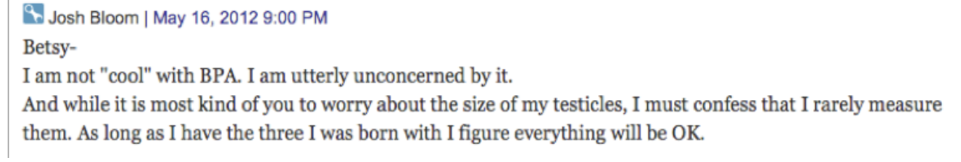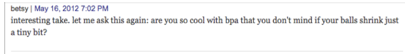 I was writing about the persistent nonsense scare relating to one of the components of polycarbonate plastics. It's called bisphenol-A (BPA)–also the topic here–and "Betsy" took exception to my article: