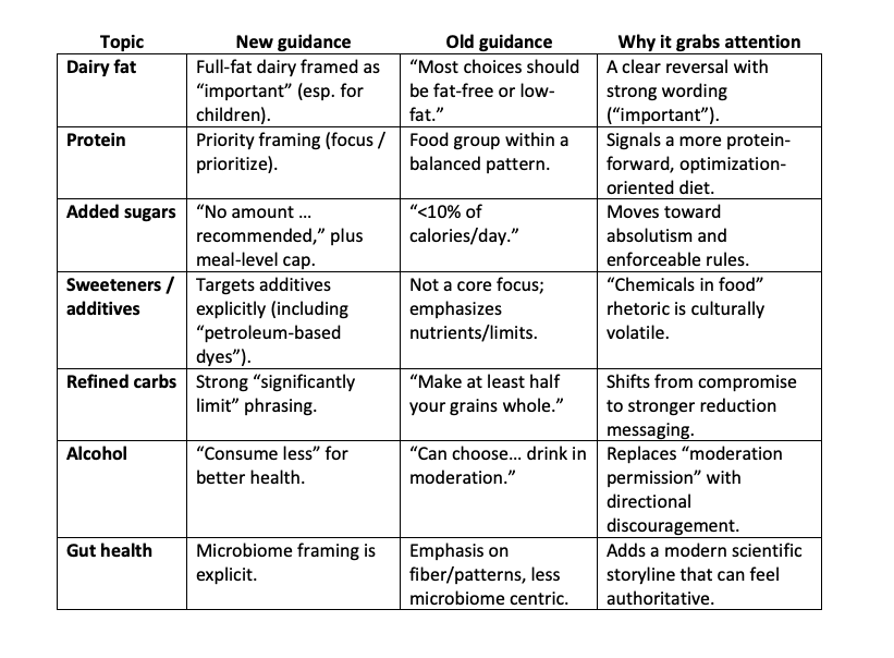 The new guidelines read like an advocacy-forward health manifesto. Its language is more behavioral, prescriptive, and moralized with heightened focus on purity (whole foods) versus contamination (processed foods, additives, “petroleum-based dyes”). It makes the message feel more apparent and more urgent. However, because it speaks in more categorical terms, i.e., “no safe level,” it becomes more like a mandate. The new guidance identifies villains (processed foods/additives), elevates preferred behaviors (protein, water), and frames “good choices” as obvious. This can be received as both empowering autonomy (“choose real food; reject industry”) or as soft coercion (“do this or you’re doing it wrong”), depending upon your nutri-political leanings.