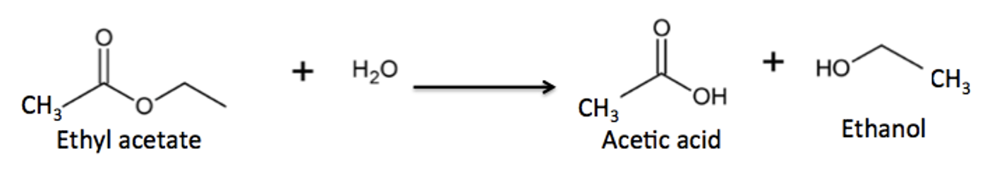 But ester formation is reversible; esters react slowly [1] with water to give back the same alcohol and carboxylic acid that they were formed from. This is an example of a hydrolysis reaction; water reacts with a substrate (usually an ester or amide) to break it into two fragments. (Figure 2).