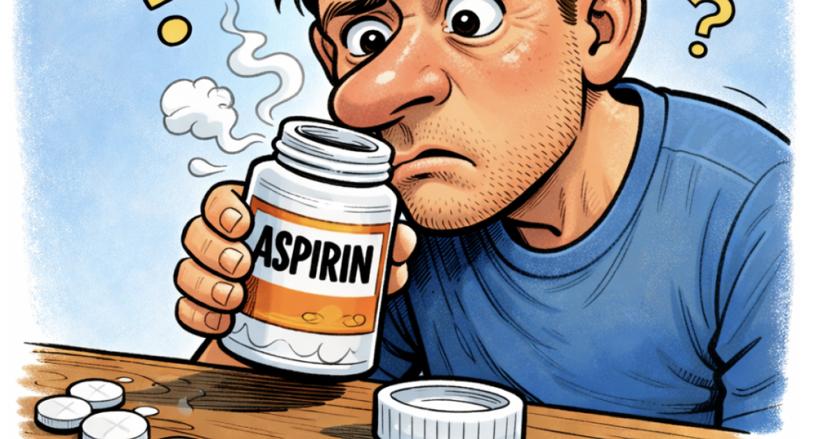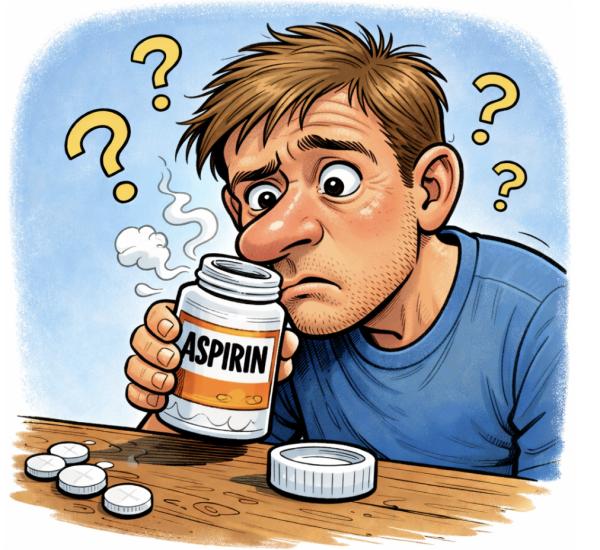 So, when you open an old bottle of aspirin, it is common to smell vinegar. This means that at least some of the aspirin has hydrolyzed. But does it matter? Very unlikely. Therefore, odor is a “yes/no” indicator of some hydrolysis, not a quantitative assay of potency loss.