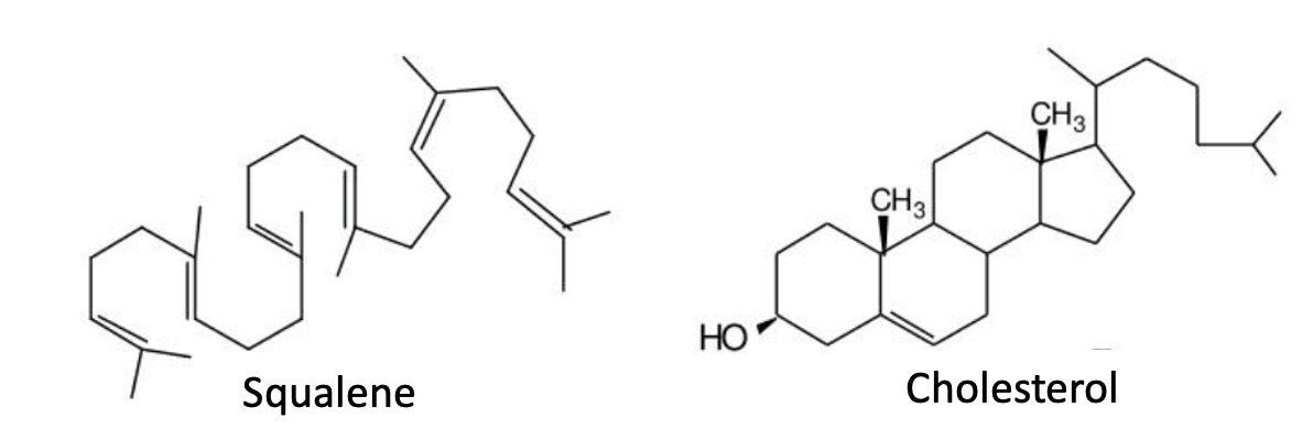 Figure 1. When squalene and cholesterol are drawn in the same conformation, it's easy to see that they are very similar, especially if you've been microdosing acid.