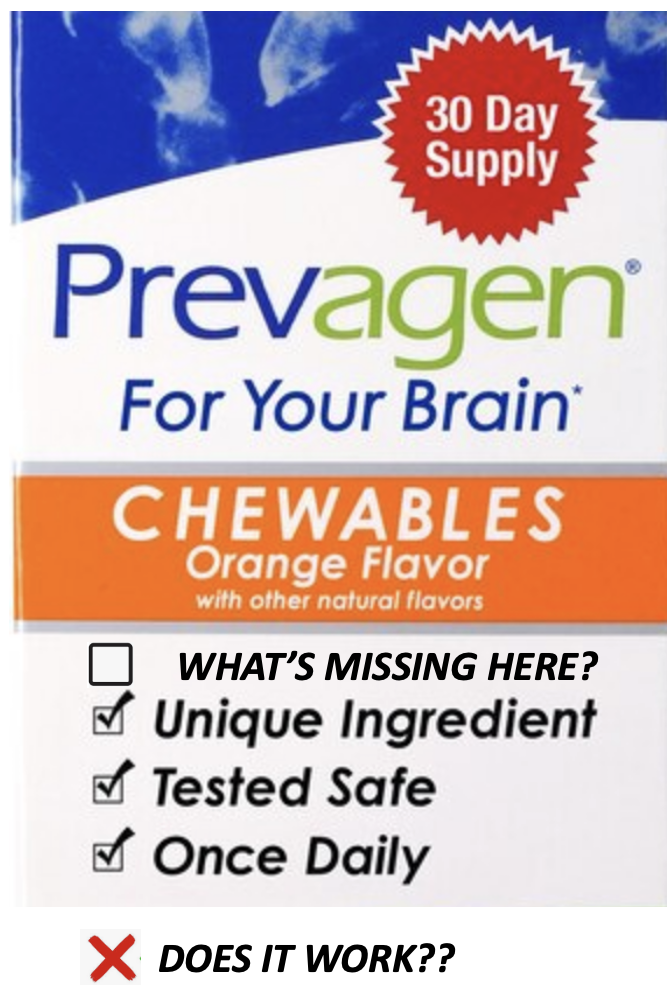 Let's hear it for Prevagen. It's safe! You only have to take it once a day! It has a unique ingredient! So does a plutonium bomb. Does it do anything useful? Careless omission?