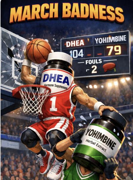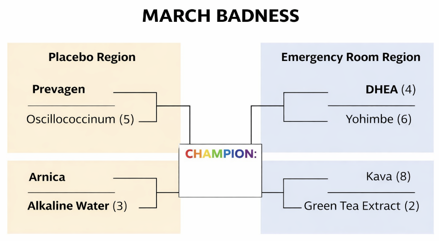 It’s March, which means March Madness, when basketball fans everywhere fill out brackets and pretend they have even the remotest chance of predicting the games. In the spirit of the NCAA tournament, I decided to create a bracket of my own. Instead of college teams, however, this one features some of the worst dietary supplements on the market competing for the title of March Badness.