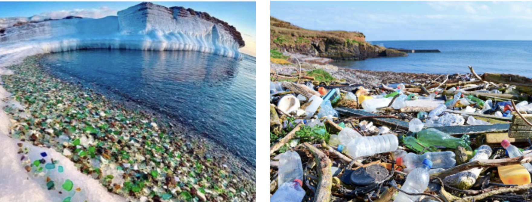 (Left) Ussuri Bay, Siberia, is "polluted" by spectacular sea glass from nearby glass factories. (Right) County Cork, Ireland, is quite a different story. Photos: The Siberian Times on Twitter, NDLA support (National Digital Learning Arena and Creative Commons