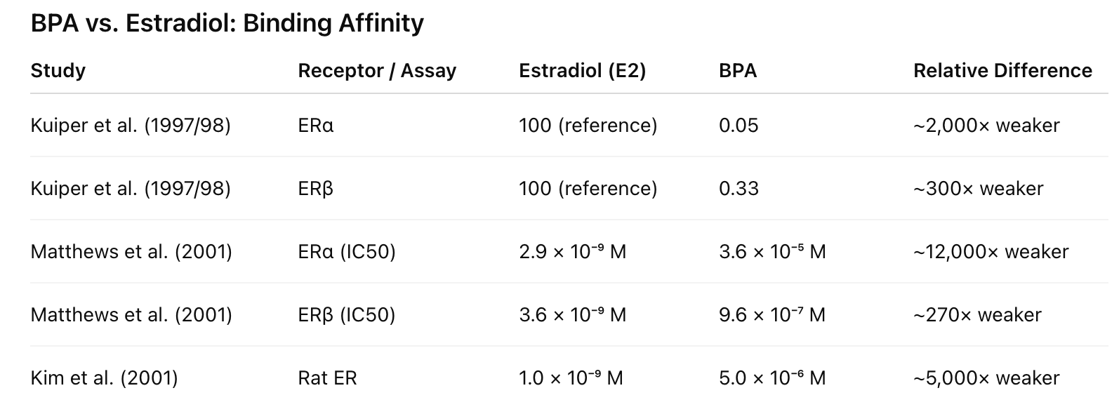 Multiple studies have shown that BPA binds to estrogen receptors hundreds to thousands of times more weakly than the body’s natural estrogen, estradiol [1–3]. In practical terms, that makes BPA a very poor competitor in a system already saturated with far more potent endogenous hormones. To have a meaningful effect, it would need to be present at far higher concentrations than are actually observed.