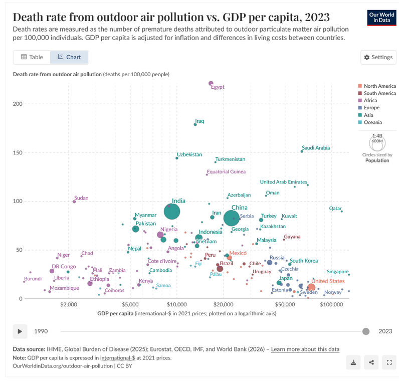 In a striking confirmation of the wealth-to-health pipeline, outdoor air pollution deaths are still lowest in the poorest and richest nations, per updated numbers from Our World in Data. Emerging economies in the middle are still climbing the EKC curve. Wealth creation driven by saving and investment in technology—environmentalism's favorite villains—are actually the solutions to our sustainability troubles. With our basic necessities provided, rich countries have the time and resources to invest in environmental clean up. This is why Americans argue about which water bottles and grocery bags are most "sustainable." Our more pressing problems have been solved.