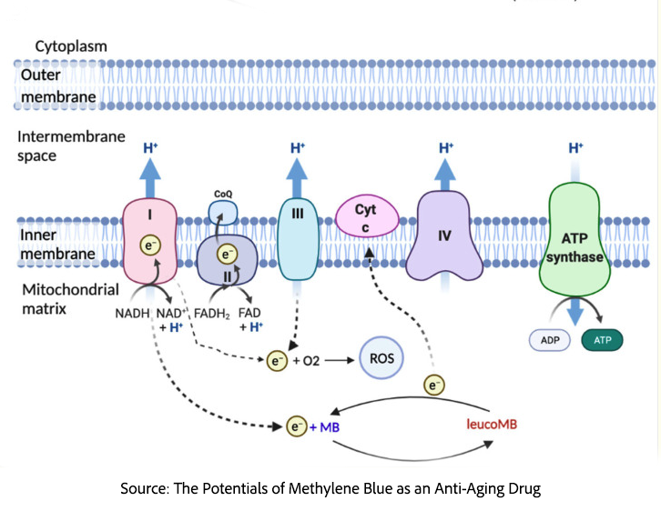 The process, however, is not perfectly controlled. When electrons accumulate or stall, particularly at Complex I, they can leak out and react prematurely with oxygen, producing the chemically damaging reactive oxygen species (ROS). Methylene blue introduces an auxiliary “scavenger” pathway because it readily switches between accepting and donating electrons. It can accept electrons from NADH and deliver them directly to cytochrome c, further down the chain, thereby keeping electrons moving and reducing the risk of leakage and ROS formation. In doing so, methylene blue helps preserve both electron flow and proton gradient buildup, stabilizing ATP production even when parts of the native system are impaired.