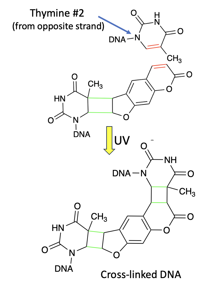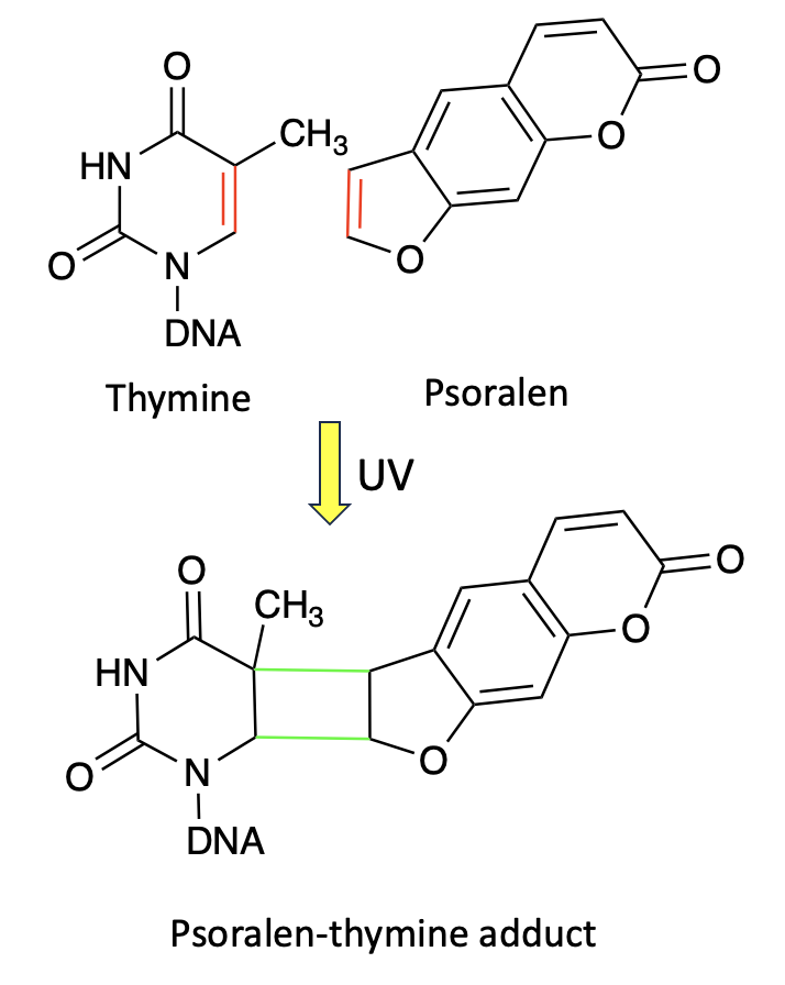 - The psoralen-DNA adduct formed in Figure 2 is now set up so that a double bond in the B ring undergoes the same cycloaddition reaction.