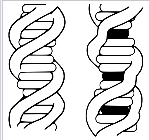 (Left) DNA strand. (Right) DNA strand with an intercalating agent inserted.