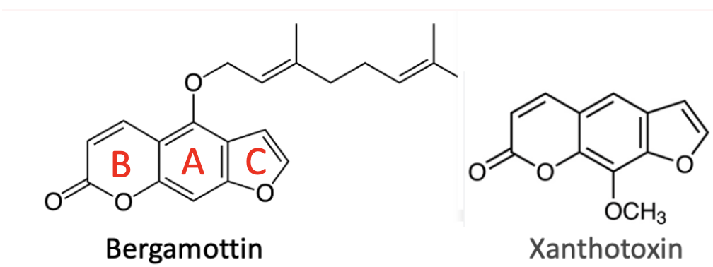 Bergamottin (found mostly in grapefruit) and xanthotoxin are two of the most important psoralens. Xanthotoxin is an approved drug marketed as methoxsalen; in conjunction with UV light, it has long been used to treat psoriasis and eczema, although it has largely been supplanted by safer, more effective modern targeted therapies [2,3,4]. How does it work?