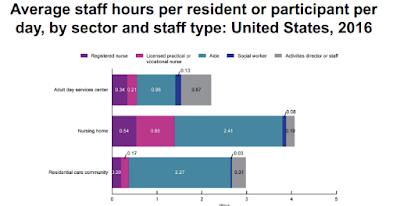 The vast majority of healthcare workers in these facilities are Aides. Each resident can expect to have 3-4 hours of care per day – mostly from Aides. Aides, mostly, are required to have a minimum of 75 hours of classroom and practical training – not much. (By contrast, a registered nurse must have either an associate degree or a bachelor degree). Of course, during off-hours like evenings, nights and weekends, staffing is often minimal.
